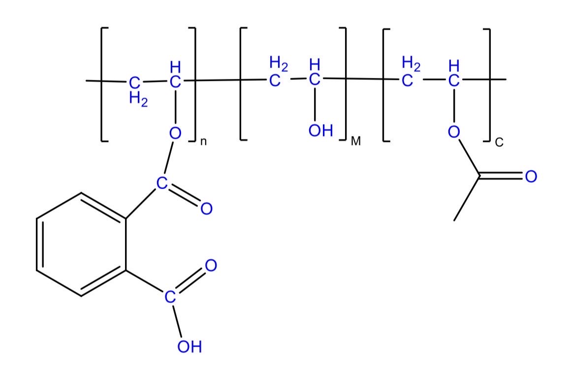 This material is widely used in the industry and only dissolves above pH 6, which delays drug absorption. Compared to other enteric polymers, CAP is hygroscopic and relatively permeable to gastric fluids. Additionally, it is susceptible to hydrolytic removal of phthalic and acetic acids, leading to changes in film properties. Due to its brittleness, CAP is typically formulated with hydrophobic film-forming materials or adjuvants to improve its enteric film. It is available as an aqueous colloidal dispersion of latex particles.