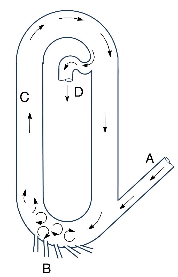 As shown in Fig. 1, the material is fed near the bottom of the mill through a venturi injector (A). As compressed air passes through the nozzles (B), the material is propelled outward against the wall of the grinding chamber, causing impact (C), and collides with other particles, resulting in attrition. The air moves at high speed in an elliptical path, carrying the fine particles out of the discharge outlet (D) into a cyclone separator and a bag collector. Larger particles are driven by centrifugal force to the periphery, where they are further subjected to attrition. The design of the fluid-energy mill incorporates internal classification, allowing finer and lighter particles to be discharged while heavier oversized particles are retained until they are reduced to the desired size.