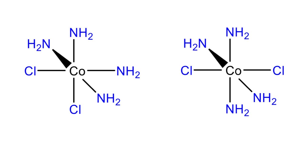 The trans stereoisomer of cisplatin is transplatin (Fig. 1). Both of these geometrical isomers have square planar structure, that is, the metal substrate and the four ligand groups all lie in the same plane. Most metal-ion coordination complexes of coordination number 4 have a square planar structure but some are tetrahedral where the central metal ion is in the center of a tetrahedron with each of the four ligands located in the four corners. Most complexes with coordination number 6 are octahedral, that is, the bonds lie along the x, y, and z axes of a coordinate system with the metal ion at the origin. Example of such a complex are the cis and trans isomers of dichlorotetraamminecobalt(III) chloride (Figure 2).