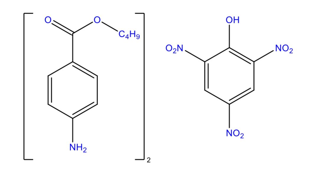 Picric acid (2,4,6-trinitrophenol) is a strong acid that forms molecular complexes with many weak bases, such as polynuclear aromatic compounds. An example is Butesin picrate (local anaesthetic) which is a complex formed between two molecules of butyl p-aminobenzoate with one molecule of picric acid. Butesin has anaesthetic property and picric acid has antiseptic property. Butesin complexes with picric acid and form butesin- picrate ointment of the complex is used in treatment of burns.