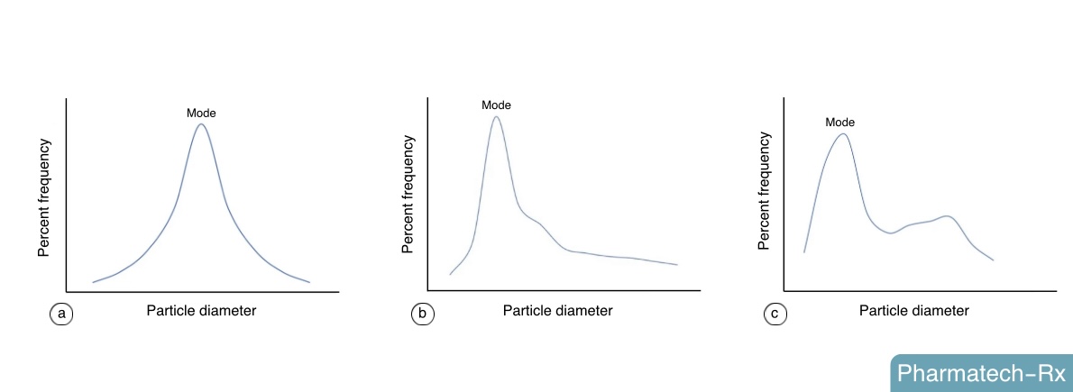 For example, the histogram in Fig. 1a is a representation of particles that are normally distributed symmetrically about a central value. The peak frequency value, known as the mode, separates the normal curve into two identical halves, because the size distribution is fully symmetrical.