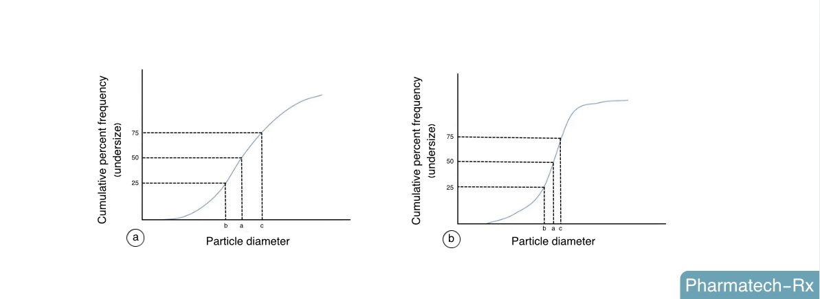 It is possible to compare two or more particle populations by means of the cumulative distribution representation. Fig. 2 shows two cumulative percent frequency distributions. The size distribution in Fig. 2a shows that this powder has a larger range or spread of diameters (less steep gradient) than the powder represented in Fig. 2b. The median particle diameter corresponds to the point that separates the cumulative frequency curve into two equal halves, above and below which 50% of the particles lie (point a in Fig. 2).