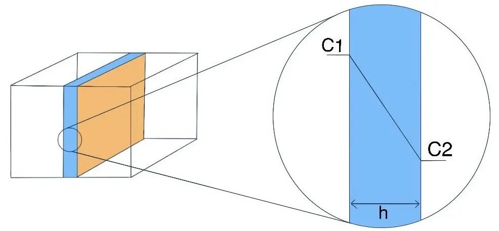 When a membrane divides the two sections of a diffusion cell with a cross-sectional area S and thickness h, and if the concentrations within the membrane on the left (donor) and right (receptor) sides are C1 and C2 respectively (as shown in Figure 2.), Fick’s first law can be expressed as: