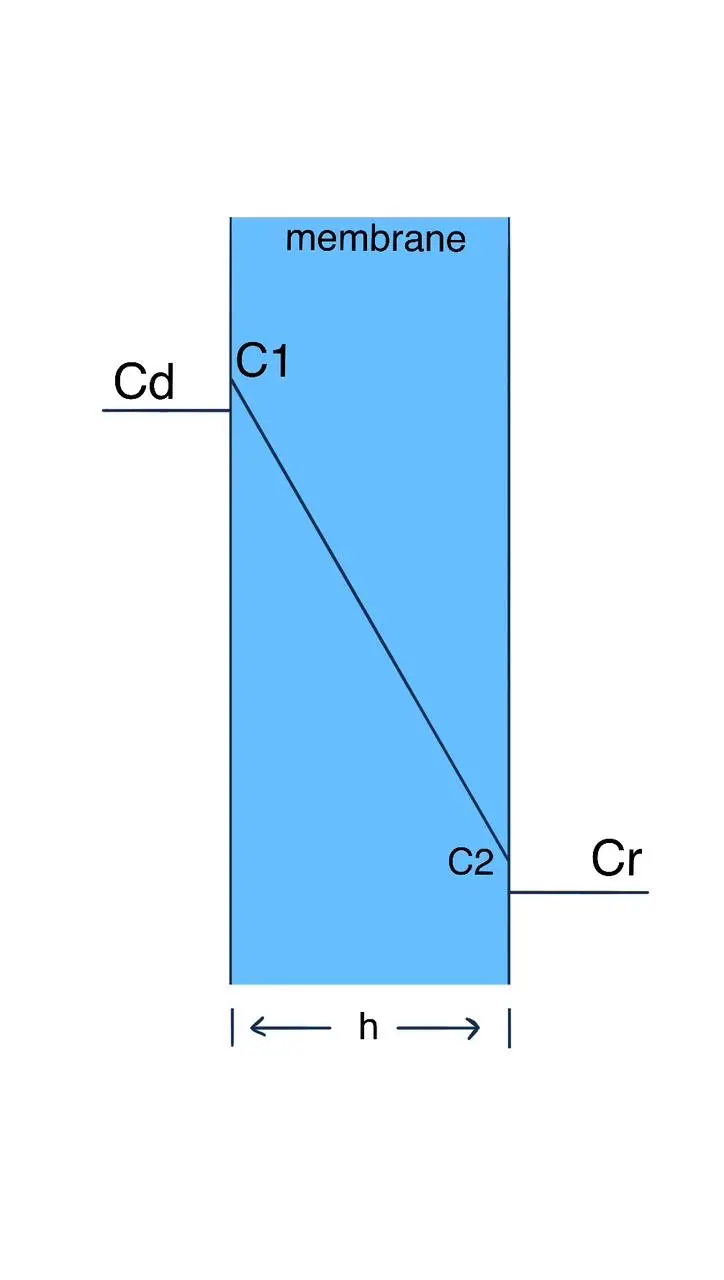 The concentrations C1 and C2 within the membrane are typically unknown but can be substituted by the partition coefficient multiplied by the concentration Cd on the donor side or Cr on the receiver side. This can be expressed as follows: