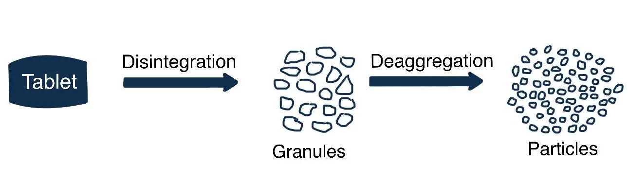 First, the liquid wets the solid and penetrates the pores of the tablet, leading to the breakup of the tablet into granules. In the second step, the granules break down into smaller particles because they contain the disintegrant (fig.1).