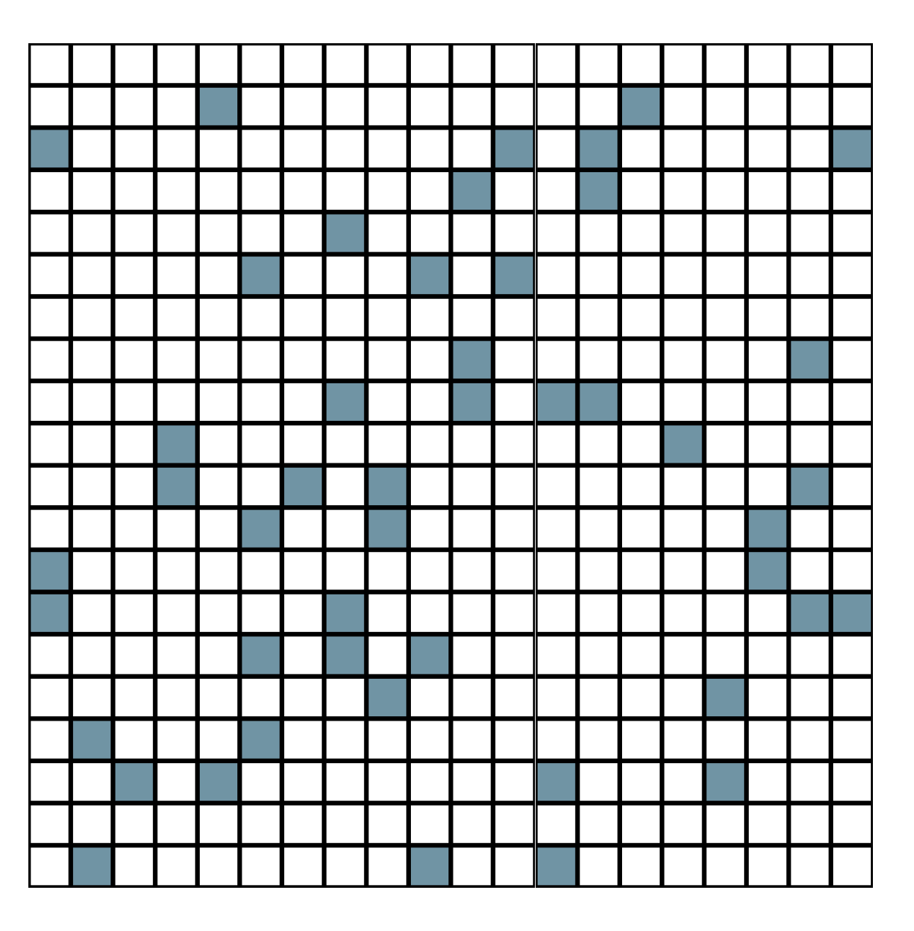 Fig. 1 shows a random mix containing only 10% coloured particles (active ingredient). If the blocks of 25 particles are examined, it can be seen that the number of coloured particles varies from 0 to 8, or 0% to 32%. Thus the number of coloured particles as a percentage of the theoretical content varies from 0% to 320%. This is considerably greater than the range of 48% to 152% when the proportion of coloured particles was 0.5 or 50%.