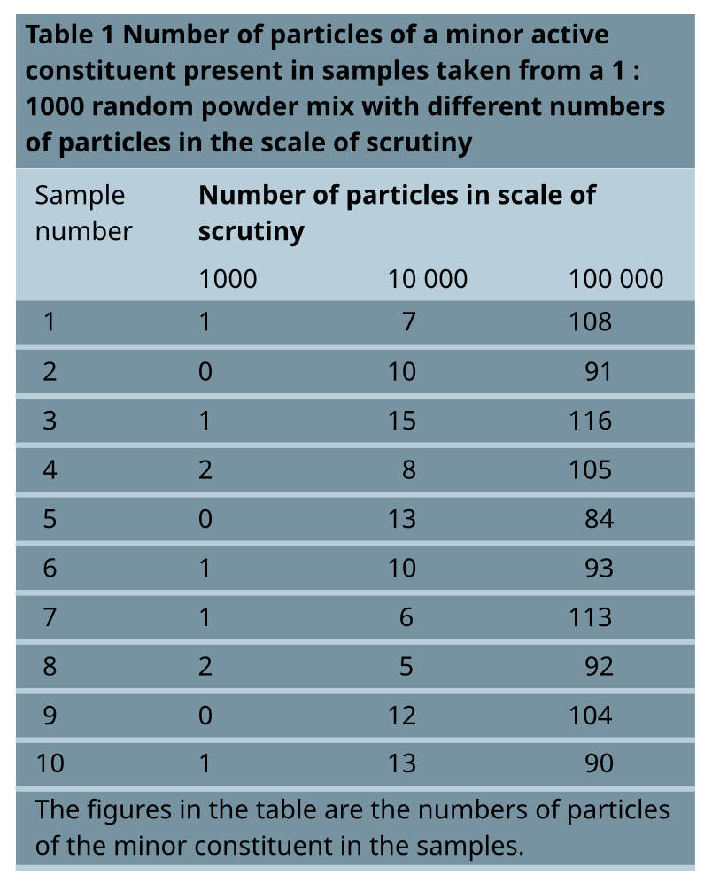 Table 1 shows how the content of a minor (potent) active constituent (present in a proportion of 1 part in a 1000, i.e. 0.1%) typically varies with the number of particles in the scale of scrutiny, when sampling a random mix. In the example shown, when there are 1000 particles in the scale of scrutiny, three samples contain no active constituent and two have twice the amount that should be present.