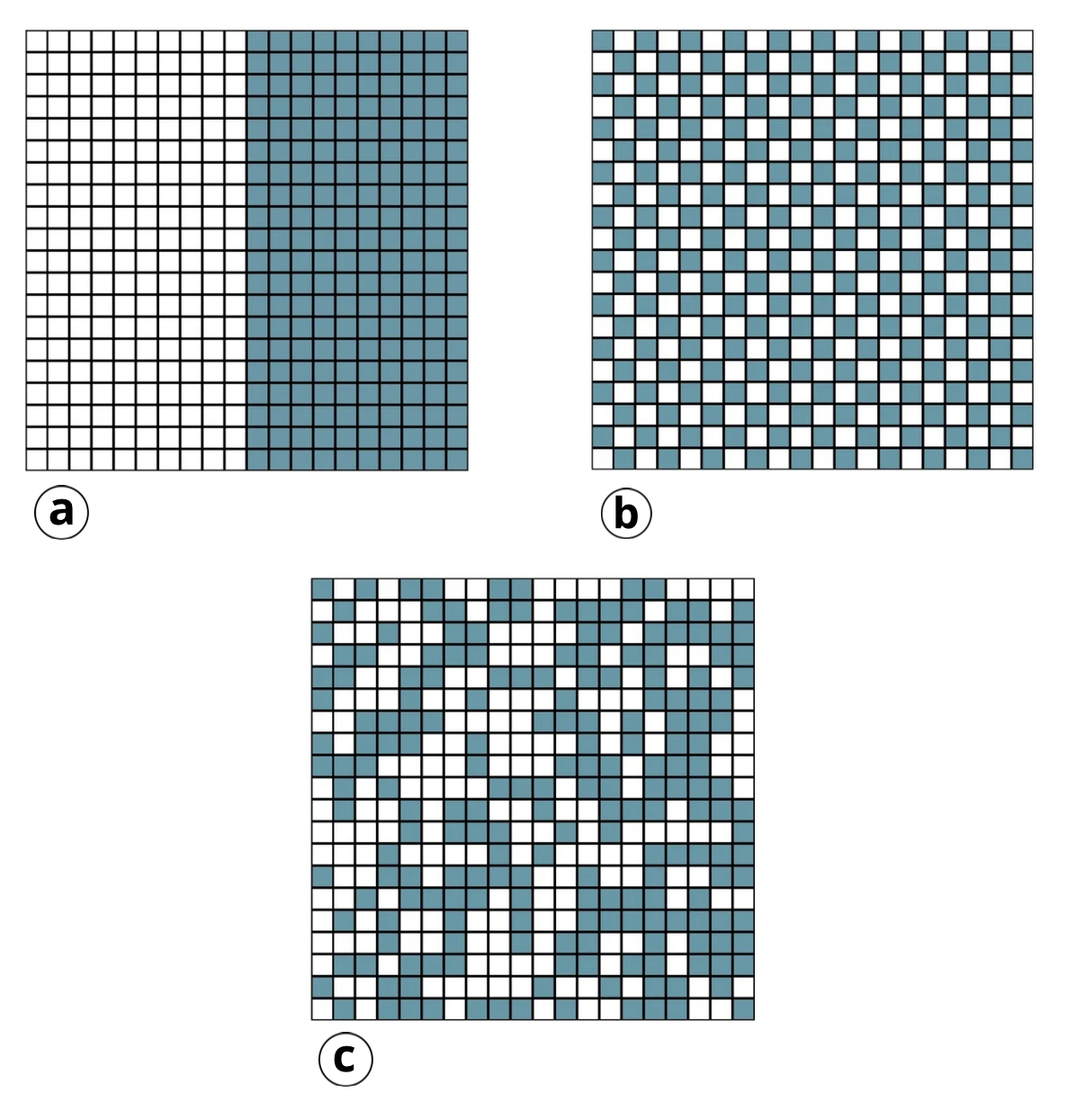If any two adjacent particles are selected from the perfect mix shown in Fig. 1b, there will always be one coloured particle and one white particle.
